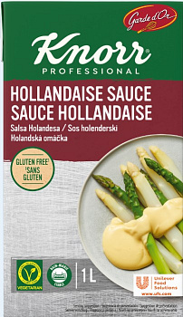 voda, rastlinné oleje (sójový, kukuričný), MASLO 5%, modifikovaný škrob, ryžová múka, biele víno 2%, cukor, jedlá soľ 1,1%, VAJEČNÝ žĺtok, emulgátor (estery mono- a diglyceridov mastných kyselín s kyselinou mono- a diacetylvínnou), citrónová šťava koncentrovaná, zahusťovadlá (xantánová guma, guarová guma), stabilizátor (difosforečnany), vínný ocot, liehový ocot, koreniny (kurkuma, kayenská paprika, borievkové bobule, klinček, koriander, škorica) zelenina (cibuľa, cesnak), kvasničný extrakt, arómy (obsahujú JAČMEŇ, MLIEKO, SÓJOVÉ bôby), extrakt z bieleho vína, horčica (HORČICOVÉ semená, liehový ocot, jedlá soľ, cukor, koreniny), farbivo (amoniakový karamel), extrakt z papriky. Môže obsahovať zeler.